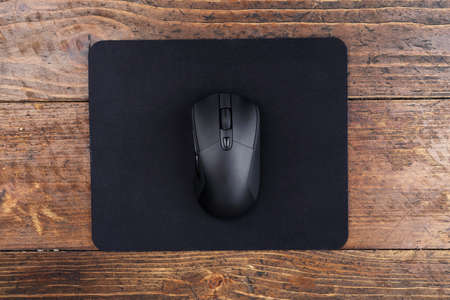 Black computer mouse on a dark wooden background. View from above.