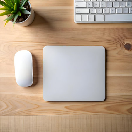 Minimalist workspace with a white mouse. keyboard. and mousepad on a light wood desk. Perfect for productivity and design concepts.