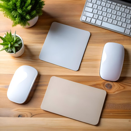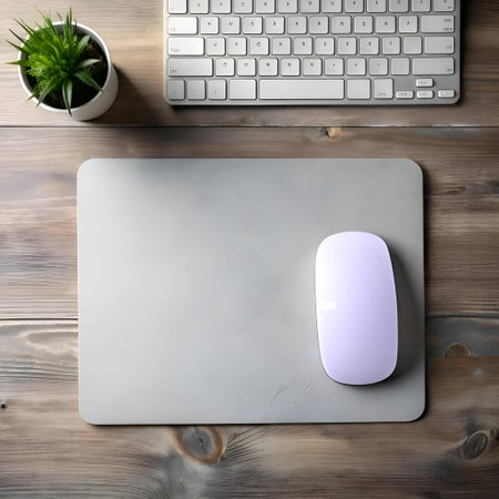 Clean and minimal workspace featuring a keyboard. mouse. mouse pad. and plants on a wooden desk. Perfect for showcasing productivity. technology. and modern design.