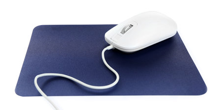 Modern wired optical mouse and blue pad isolated on white