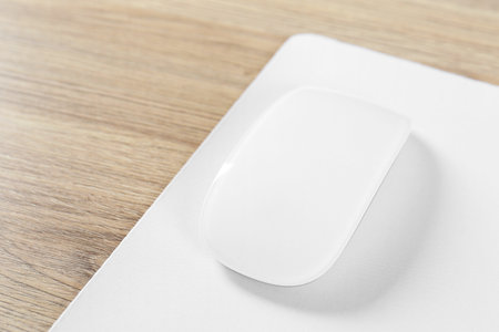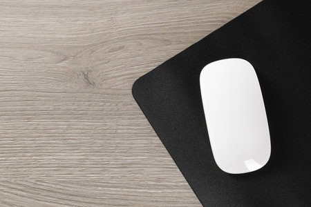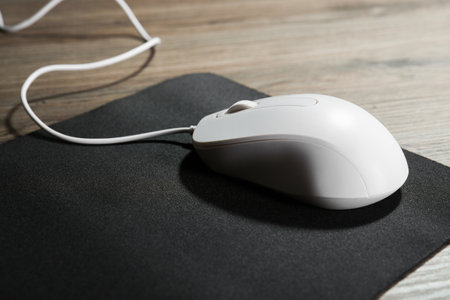 White computer mouse and mousepad on wooden table