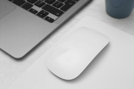 Computer mouse and mousepad on white table, top view. Space for text