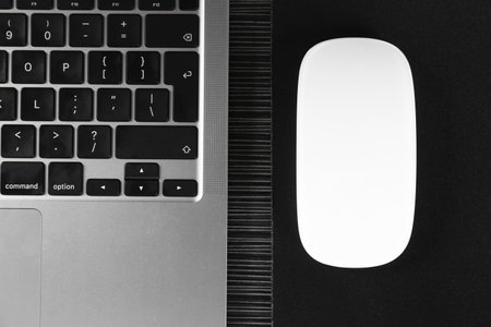 Computer mouse on a black laptop on a white background, close-up