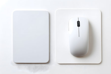 A clean white computer mouse rests on a smooth white pad next to a blank white rectangle.
