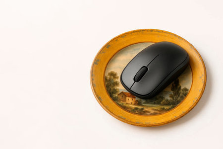 Computer mouse on a decorative plate. Space for text