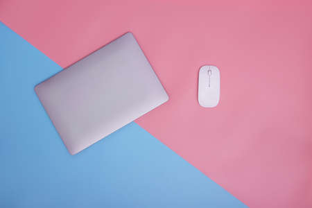 Laptop and wireless mouse on pink and blue background. copy space. top view.