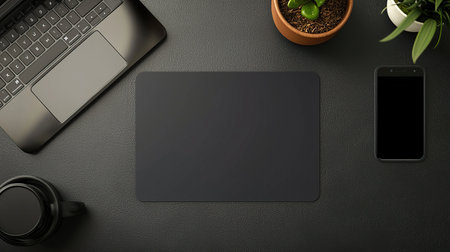 Workspace arrangement with laptop, smartphone, plant, and coffee cup on dark surface