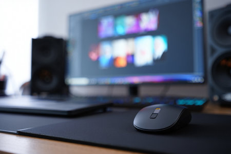 Explore the striking design of a gaming mouse in a vibrant tech workspace.