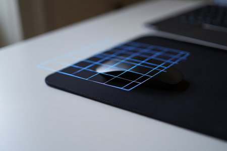 Blue grid pattern on black mouse pad. Ergonomic wrist rest. White desk environment. Digital design data organization. Technological innovation.
