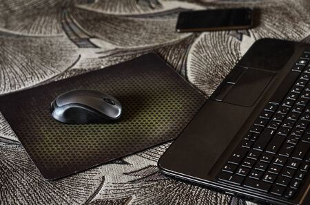Gaming mouse and keyboard on black mat. Mouse and keyboard with copy space.