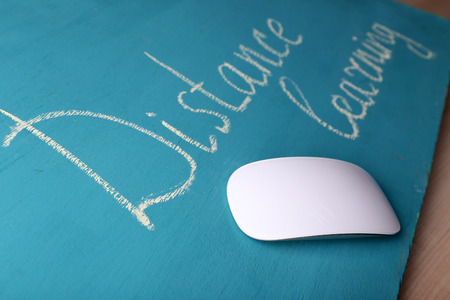 Computer mouse and inscription Distance Learning on blackboard on wooden table background
