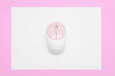 Modern computer mouse on color background