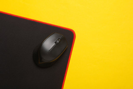 Black PC mouse with PC mouse pad on a yellow background