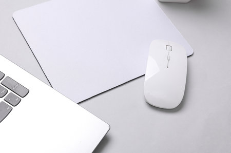 Mockup of white blank computer mouse pad or mat with props, mouse and laptop on gray background. Top view. Flat lay