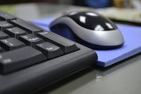 Mouse keyboard on desk. Home office computer. Monitor accessories. Modern setup electronics.
