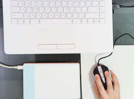 child hand use mouse pointer with laptop on topview