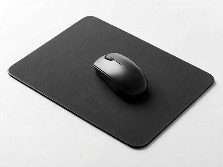 Close-up shot of a black computer mouse resting on a textured mouse pad on a glass desk. The image captures a professional workspace, ideal for tech enthusiasts and office settings.