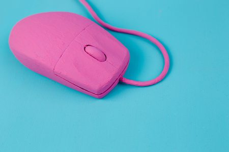 Minimalist background with computer device on pink background. Gray wireless computer mouse. Copy space, selective focus.