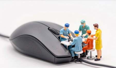 A group of tiny surgeons, dressed in colorful scrubs, carefully operate on a computer mouse, showcasing a whimsical blend of technology and medical skills. Their focus highlights teamwork.