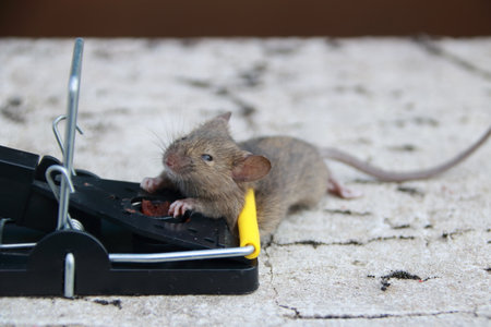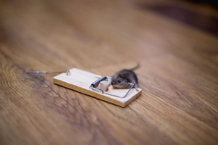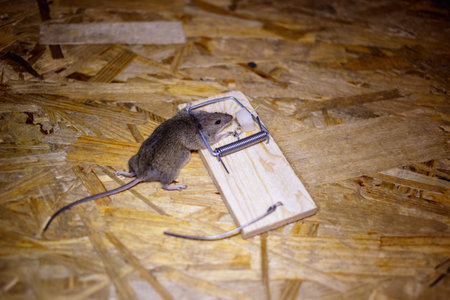 Dead mouse in a mousetrap on the floor at home, mousetrap and mouse
