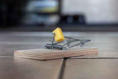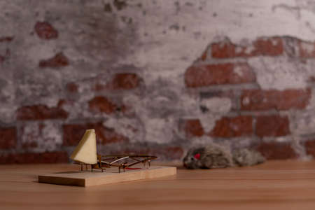 mouse trap with cheese and toy mouse approaching, on wooden floor and brick wall
