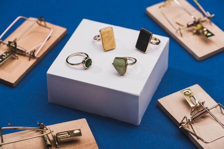 Close up view of jewellery rings on white stand by mouse traps on blue background