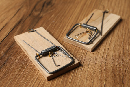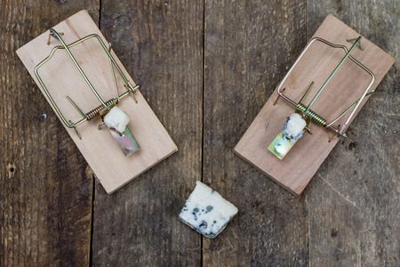 Many cocked spring wooden bar mouse traps loaded with cheese, viewed from above on dark wooden surface background