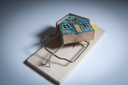 Mousetrap with loan bait on blue-pink pastel background. Traps, risks or deception concept