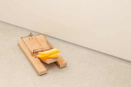 cocked mousetrap with a piece of cheese stands near rat or mouse holes