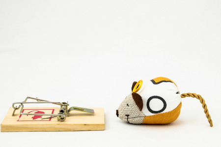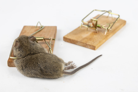 The mouse is caught on the mousetrap. Killing mice in households. Light background.