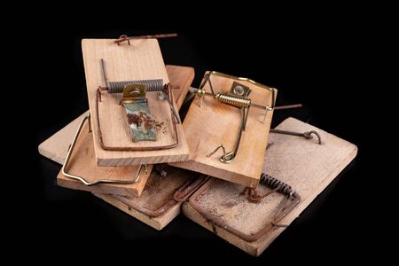 Mousetrap without bait isolate on a black background. Stock photo traps.