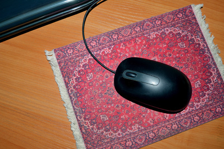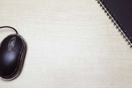 wireless black computer mouse on the table on the rug. space for text