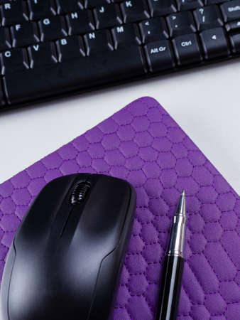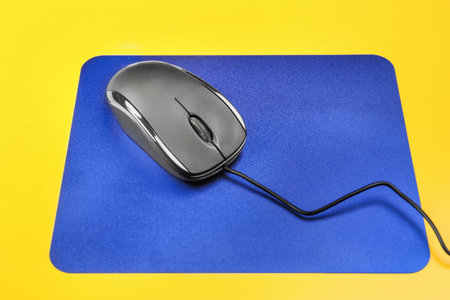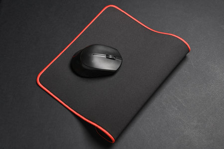 Computer mouse black lies on the Mat on the table.