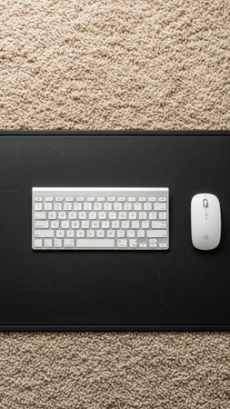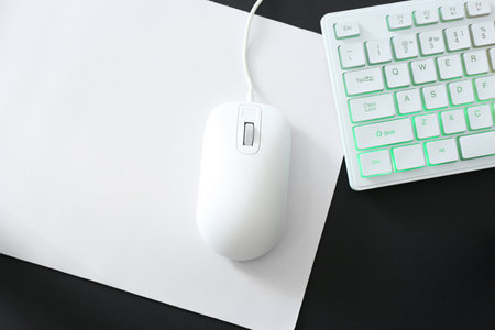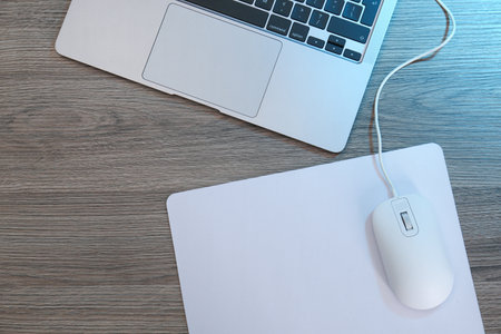 Top view of a clean. minimalist workspace with a white mouse. keyboard. and mousepad on a wooden desk. Perfect for showcasing technology. productivity. or work from home concepts.