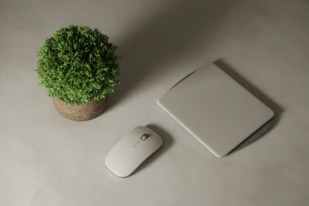 Overhead view of a clean and organized desk featuring a small potted plant, a closed notebook, and a white computer mouse on a neutral surface, creating a serene workspace.