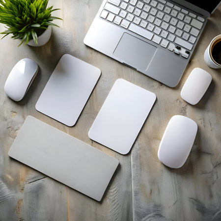 A clean and modern workspace featuring a laptop. mouse pad. two white mice. a plant. and two blank white cards. Perfect for showcasing your brand or product design.