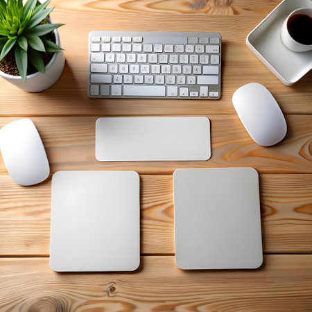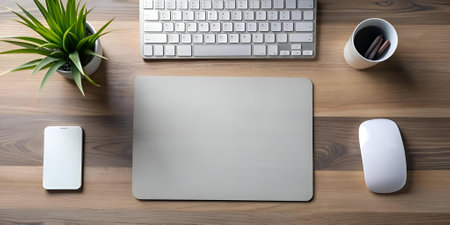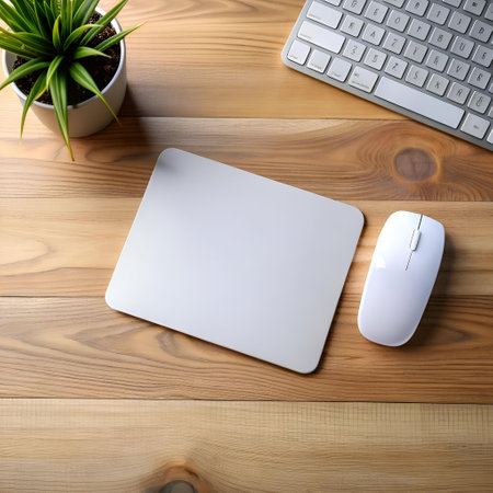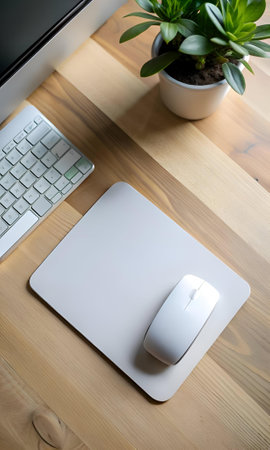 A clean and modern workspace with a white mouse on a grey mousepad. a keyboard. and a potted plant on a wooden desk. This image is perfect for illustrating productivity. technology. and work from home concepts.