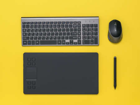 graphic tablet, keyboard and mouse, on yellow background. zenith view photo.