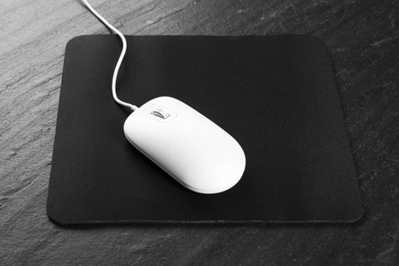 White wired mouse and mousepad on black textured table