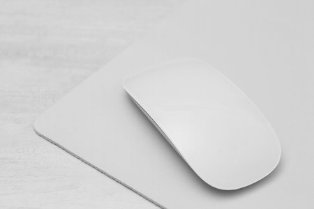 White computer mouse and mousepad on wooden table