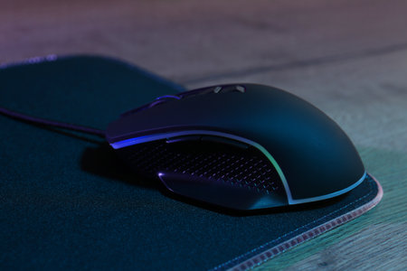 Black computer mouse and mousepad on wooden table in neon lights, closeup
