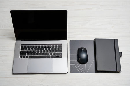 A laptop, mouse, and notebook are neatly arranged on a white surface.