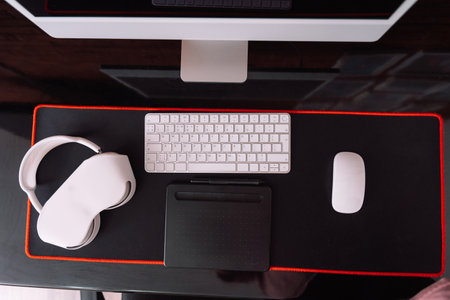 Blank and black computer mouse pad on the desk at home. Mousepad mockup. Copy space for your picture or text. Empty mouse mat ready for your design. Mock up, template. 3D render.