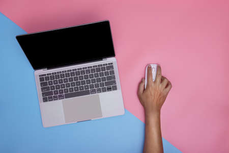 Man using laptop and wireless mouse on pink and blue background. copy space. top view.
