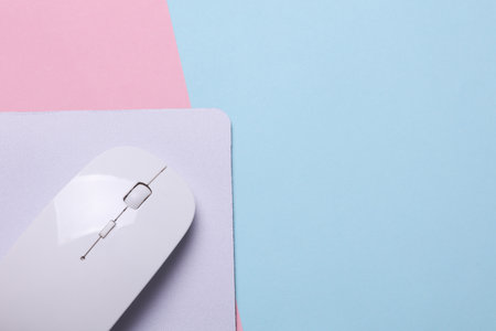 Mockup of white blank computer mouse pad or mat with wireless mouse on blue pink background