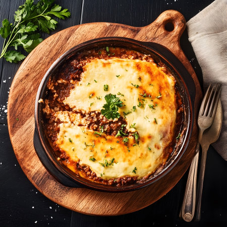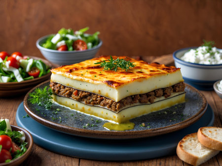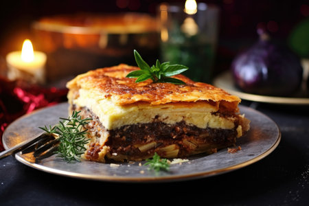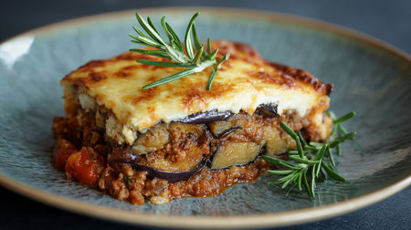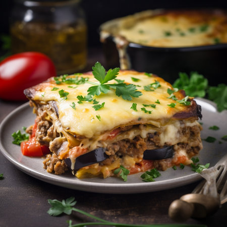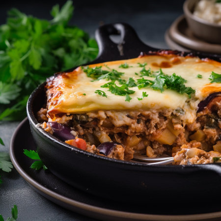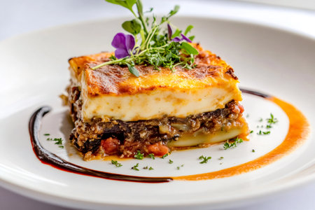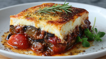 Traditional Greek moussaka, featuring layers of flavorful meat, eggplant, and creamy bechamel sauce, garnished with fresh herbs