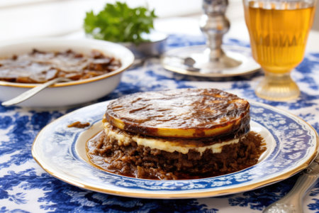 a plate of moussaka dish on a blue-and-white tablecloth, created with generative ai