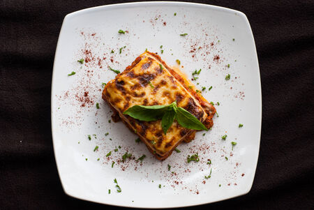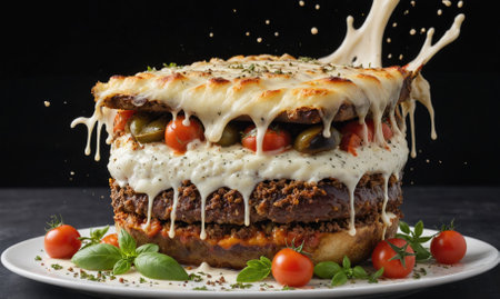 Delicious layers of meat and cheese create a comforting, hearty dish on display.