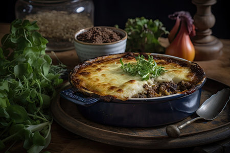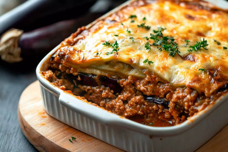 An eye catching illustration of Greek moussaka in baking dish with the ingredients. Created using Generative AI tools.