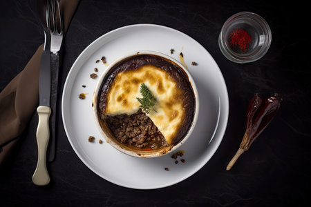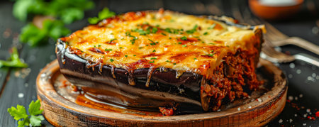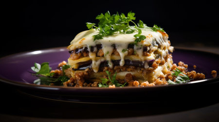 Moussaka Dish, Traditional Greek Musaka, Bulgarian Mousaka, Eggplant Musaca or Musakka on Dark Background, Abstract Generative Ai Illustration